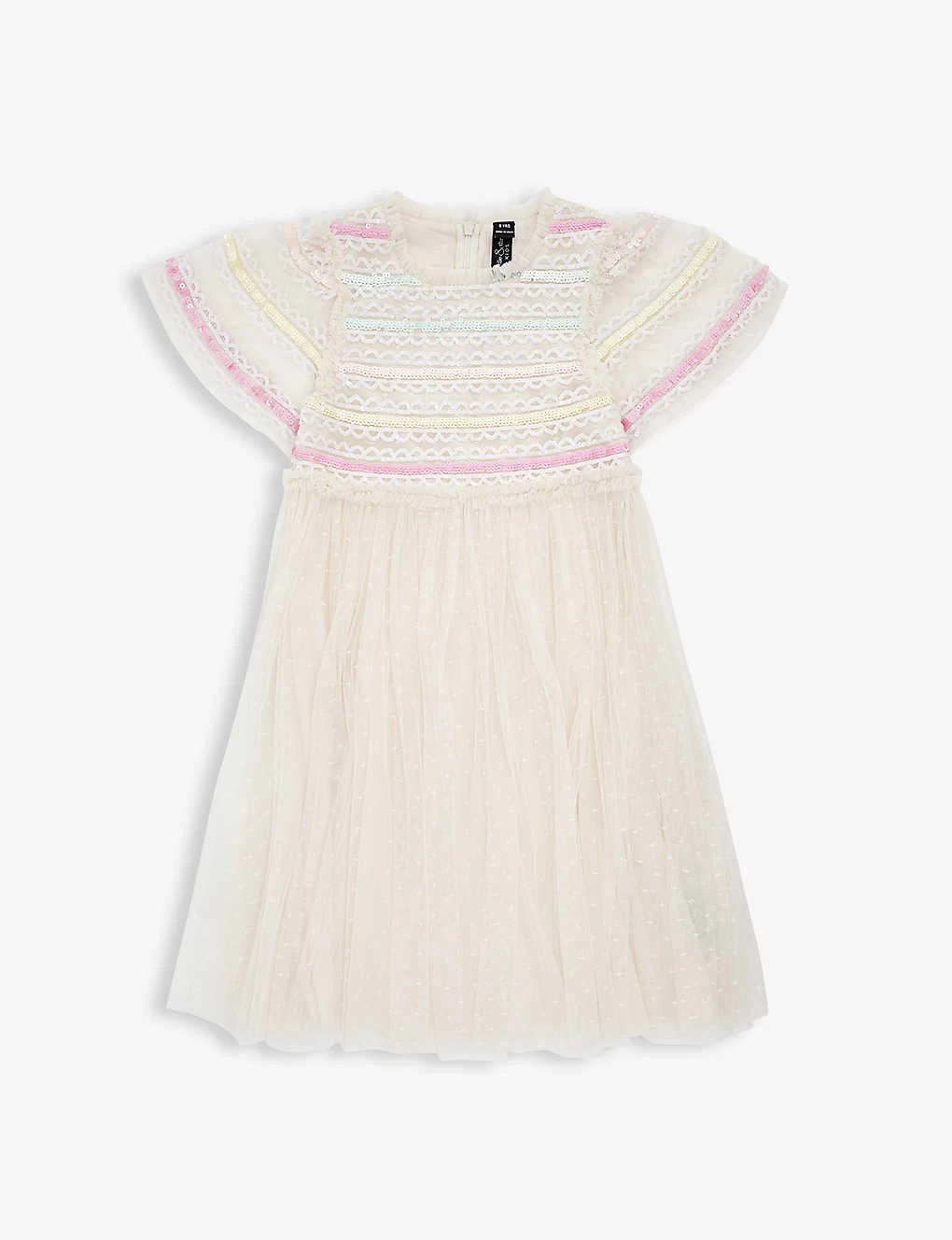 - Regular fit, round neckline, short flutter sleeves, all-over sequin embellishment at bodice, ruffle trims, flared hem, fully lined
