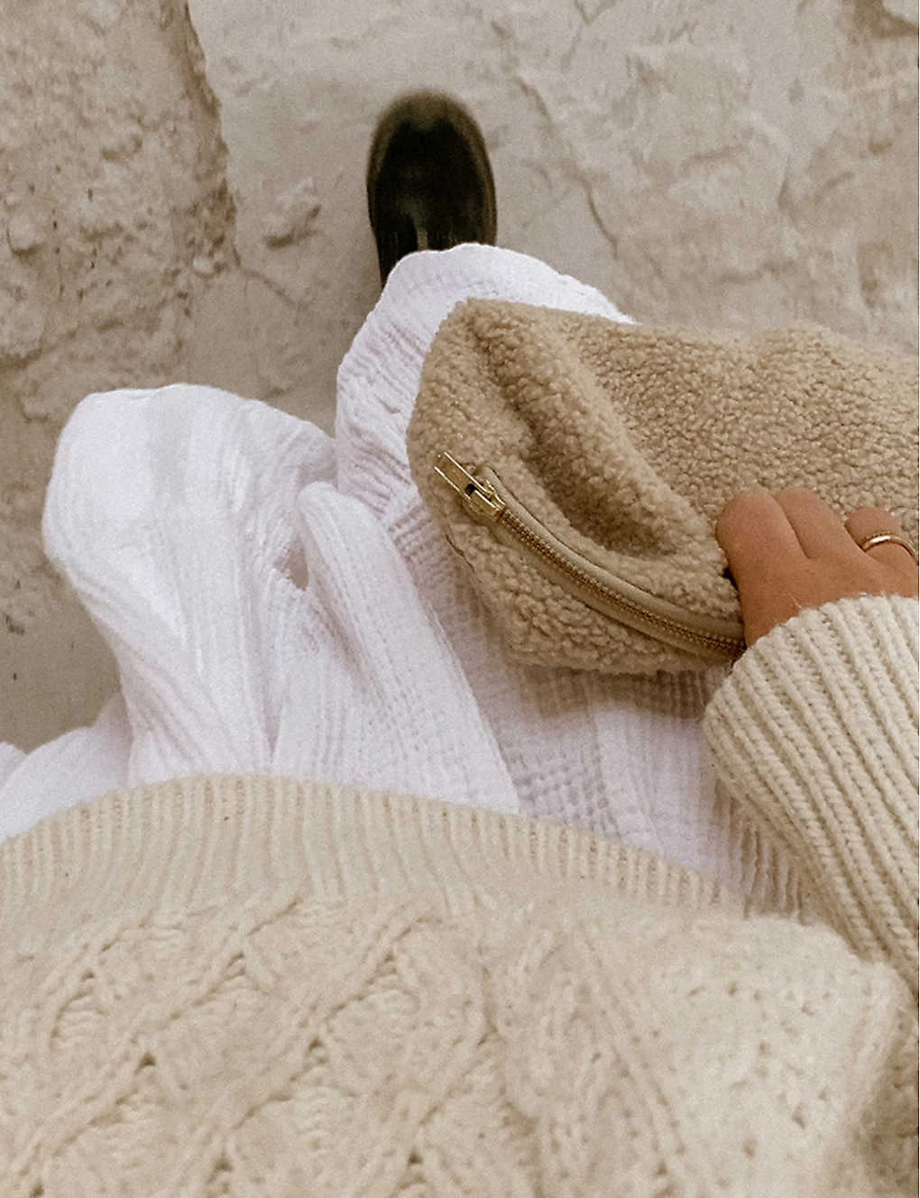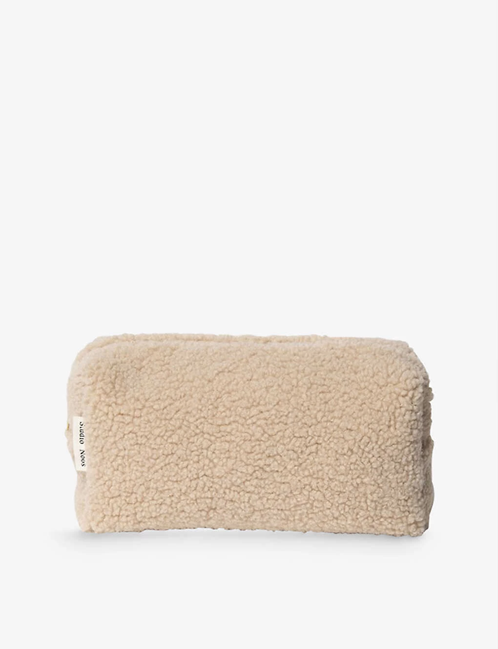 - One main compartment, all-over teddy texture fabrication, embroidered logo at front, gold-tone hardware, handmade