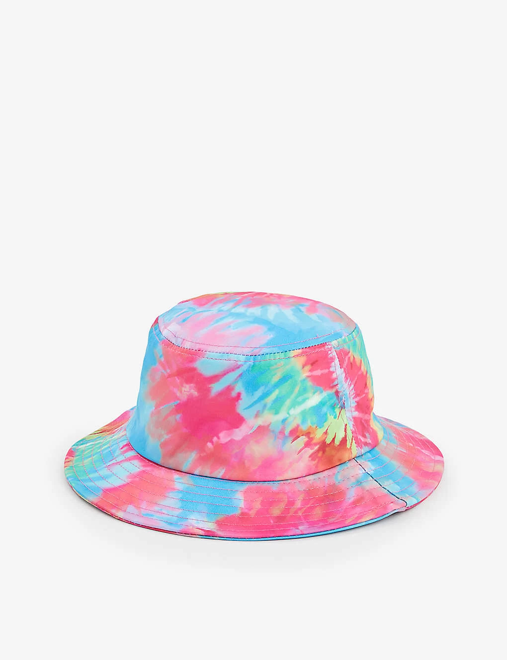 - Bucket shape, wide brim, all over tie-dye print, internal sweatband, fully lined