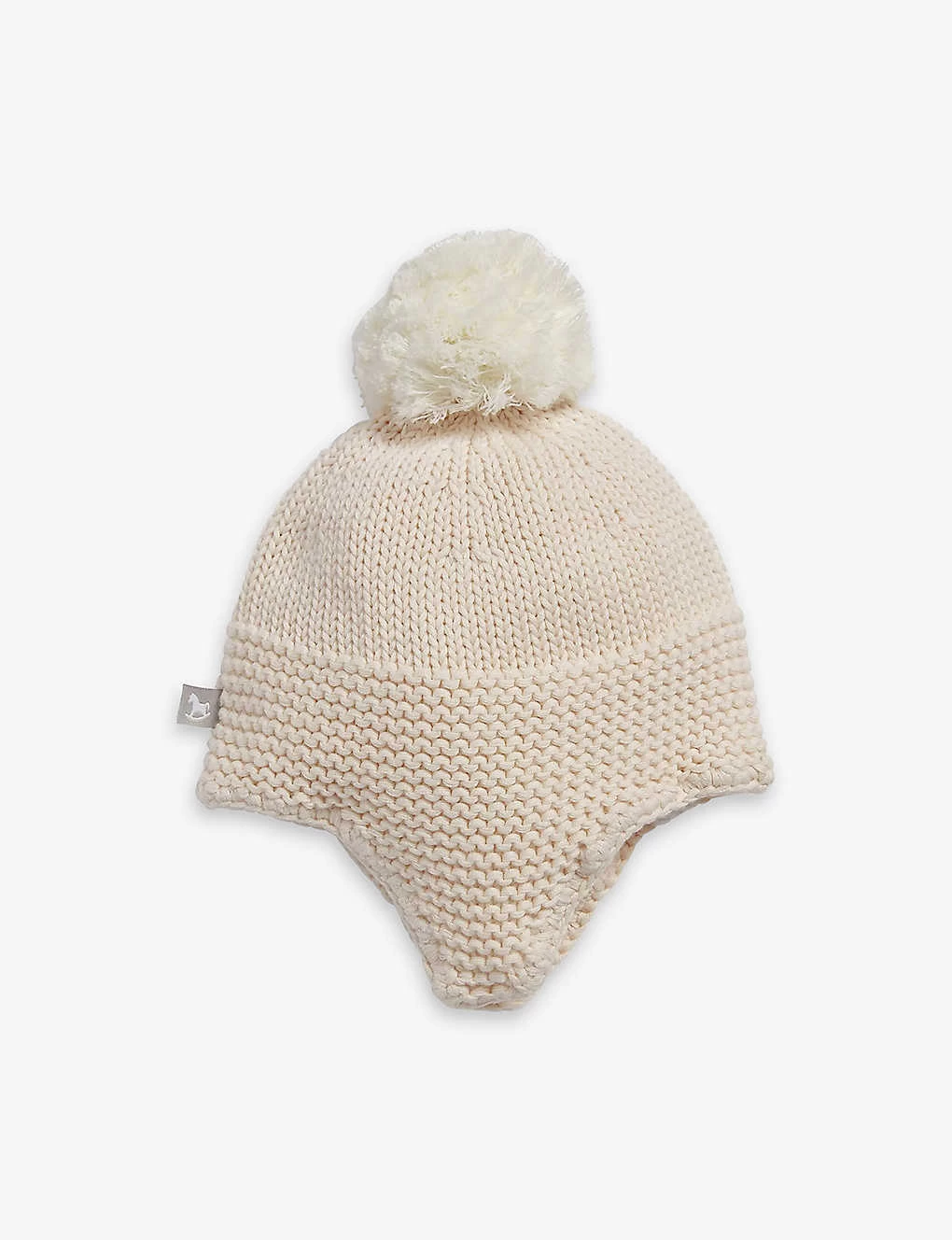 - Panel at sides, pom-pom embellishment on top, all over knitted