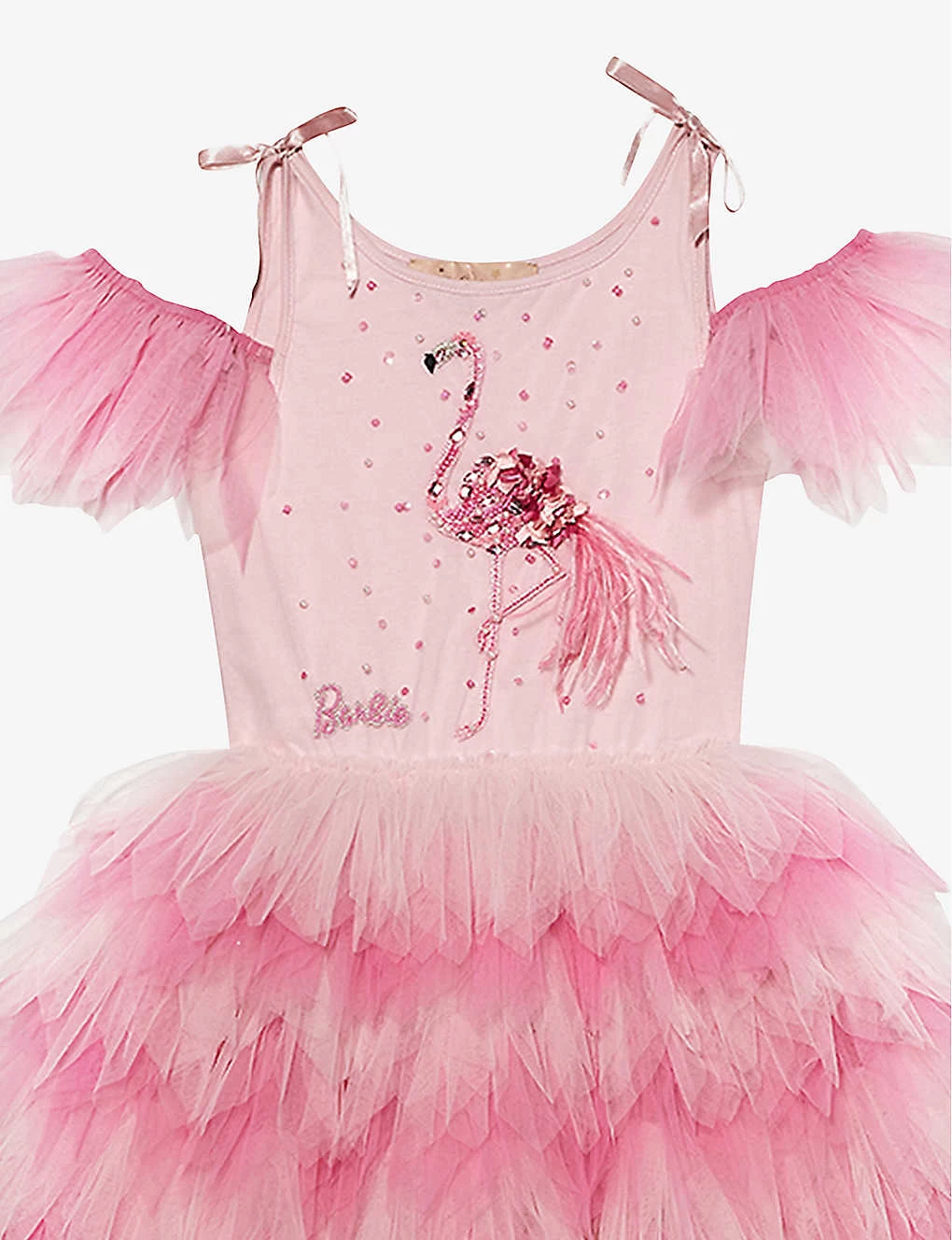 - Barbie themed, round neckline, cut-out shoulder, frilled short sleeves, embroidered flamingo-motif bodice, tiered and layered skirt, lined