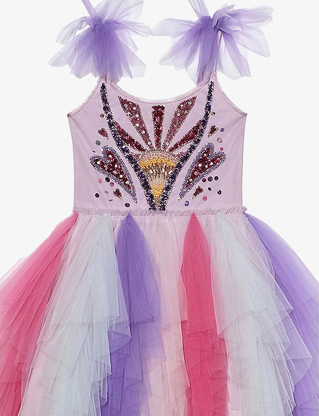 - Barbie Springs themed, Sweetheart neckline, thin straps, pom-pom detail on strap, embroidered bodice, tiered and layered skirt, lined