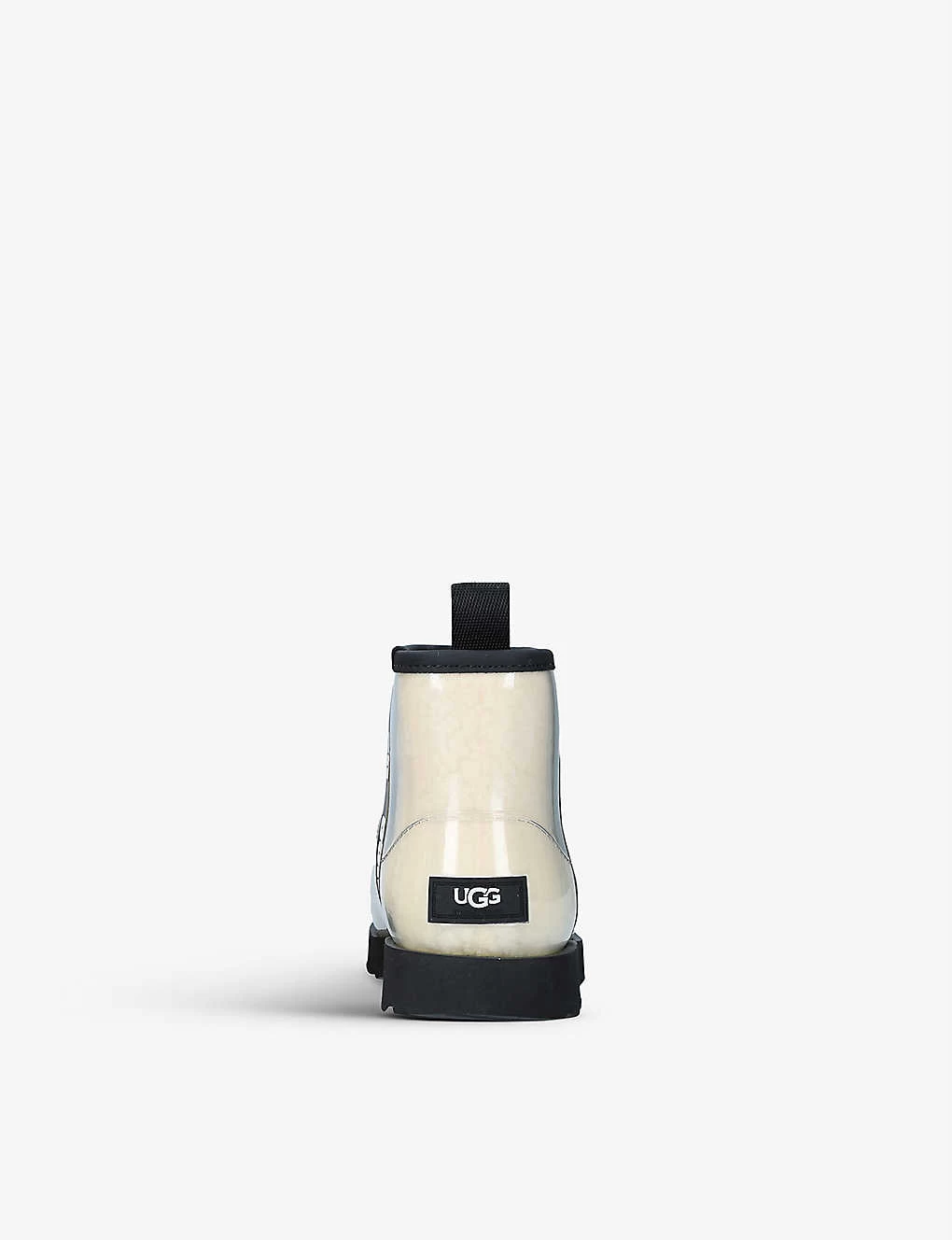 - Round toe, transparent upper, mid-top cuff, branded trim at side, pull tab at heel, faux-shearling lining, removeable insole